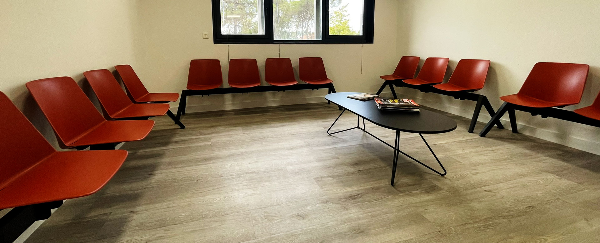 Pour cet espace, Adeline a sélectionné les poutres d’attente Reno qui privilégient un confort d’assise suffisant ainsi qu’un large choix de coloris pour personnaliser l’assise. Ici, les clients ont sélectionné le coloris rouge brique qui apporte de la couleur à cet environnement. En complément, Adeline a proposé la table basse ovale Shark qui a séduit par sa compacité et son design. Entièrement noire, elle ajoute un contraste avec le coloris vif des poutres d’attente tout en faisant écho avec le piétement des poutres d’attente.