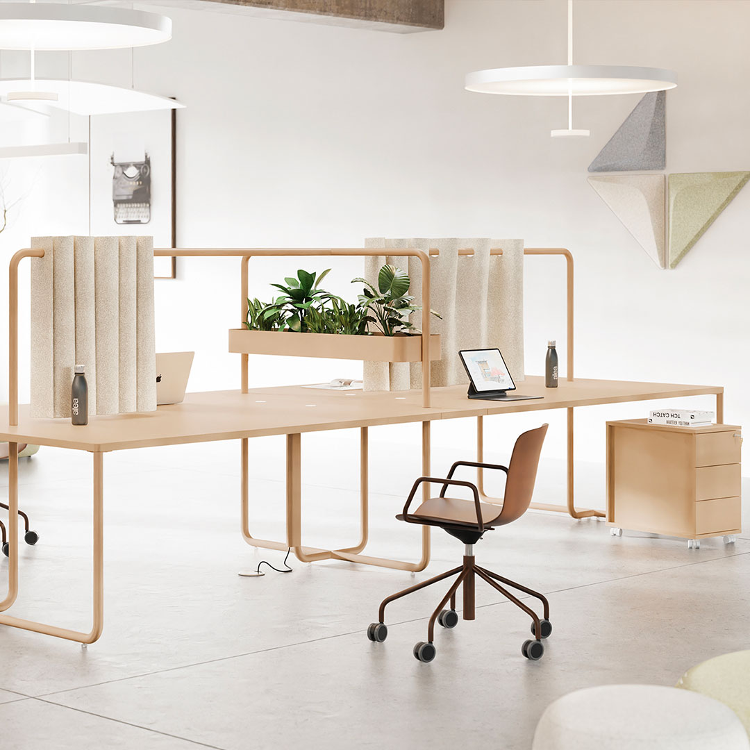 Pour structurer le plan de travail et améliorer l’organisation, SKYLINE peut intégrer des étagères (rectangulaires ou organiques), des porte plantes et des compartiments encastrés entre demi plateaux. Un espace entre demi plateaux peut aussi recevoir des bacs en tôle courbée, complétés par une réglette coulissante en bambou (épaisseur 20 mm) pour organiser les petits objets. Pour gérer l’intimité et moduler les usages, le bench accepte des écrans frontaux punaisables et des écrans latéraux amovibles, ainsi qu’un rideau qui apporte une séparation plus “dynamique” selon les besoins.