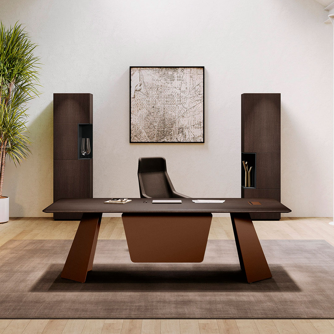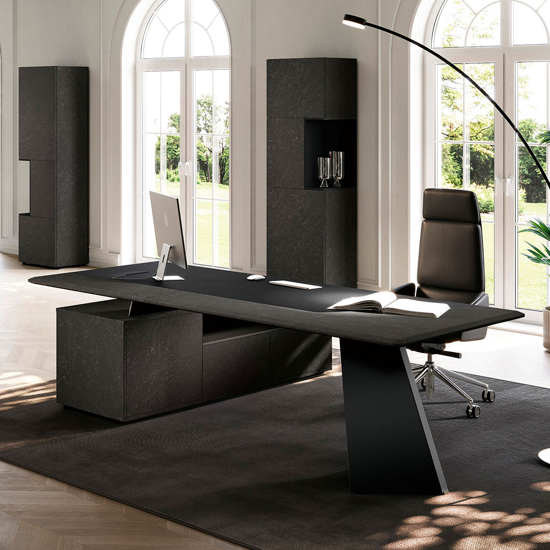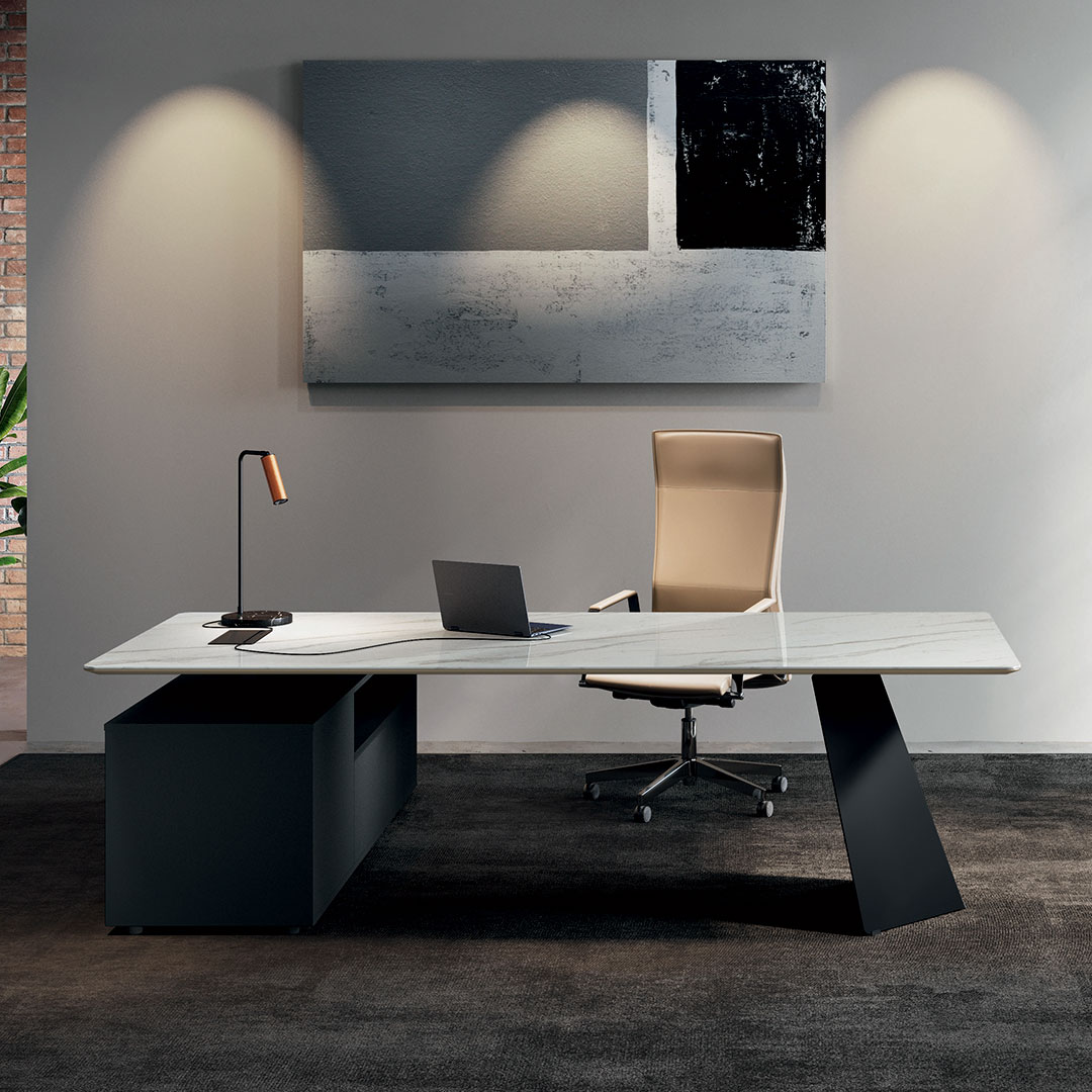 Avec son plateau en céramique effet marbre, il incarne le parfait équilibre entre esthétique contemporaine et fonctionnalité professionnelle. Disponible en deux dimensions (L 210 ou 240 x P 100 x H 74,8 cm), il s’impose comme la pièce maîtresse des espaces de direction et de management.