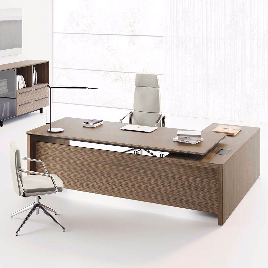 Le bureau de direction Lana sur crédence est une solution idéale pour les espaces de direction contemporains. Cette version est équipée d’un plateau bois et intègre une crédence fonctionnelle, avec rangements et top-access. Disponible en retour gauche ou droit, il offre une configuration professionnelle, sobre et élégante.