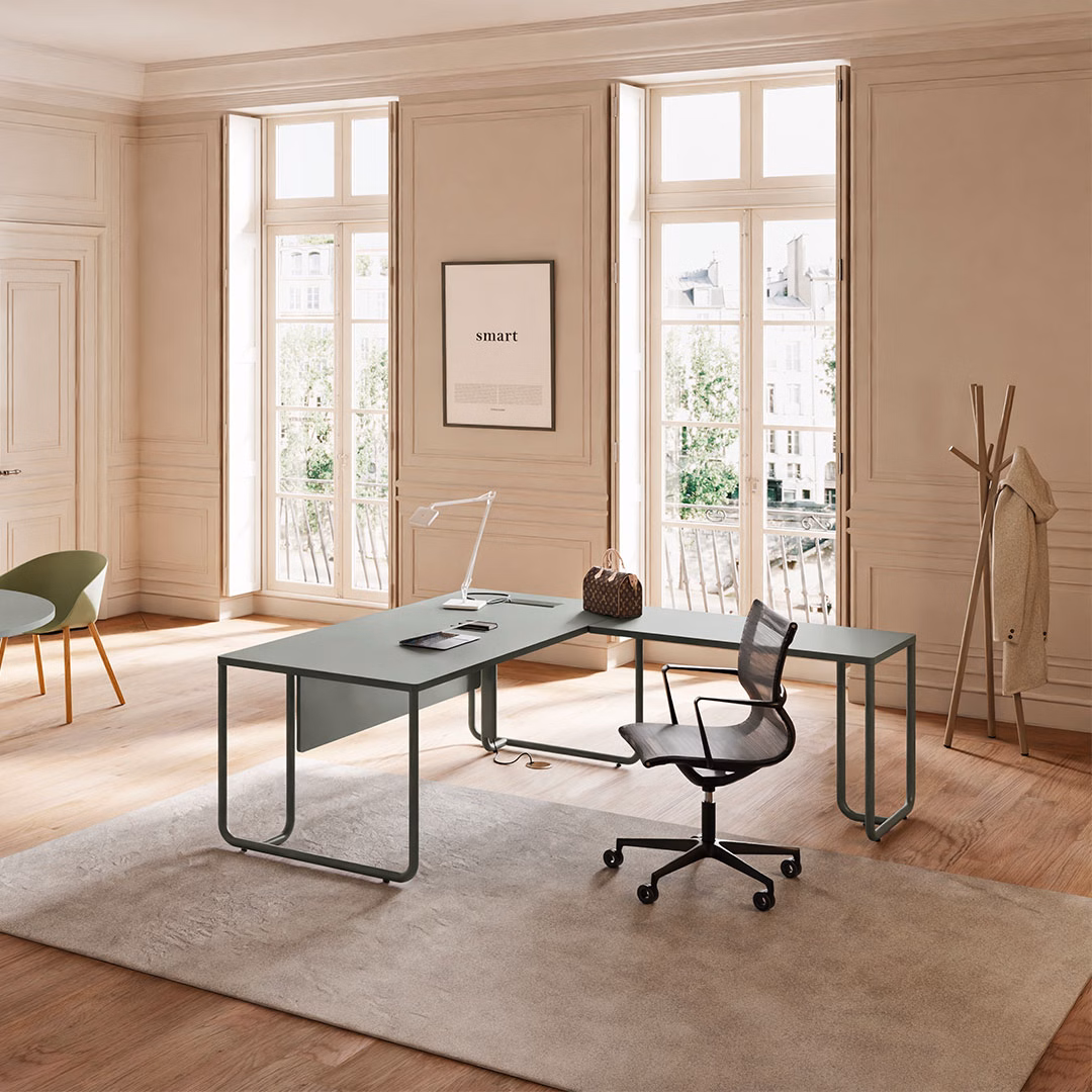 Grâce à son retour, SKYLINE permet de séparer naturellement les zones de travail et de pose, tout en conservant une esthétique élégante portée par une structure en tube acier au rendu léger.