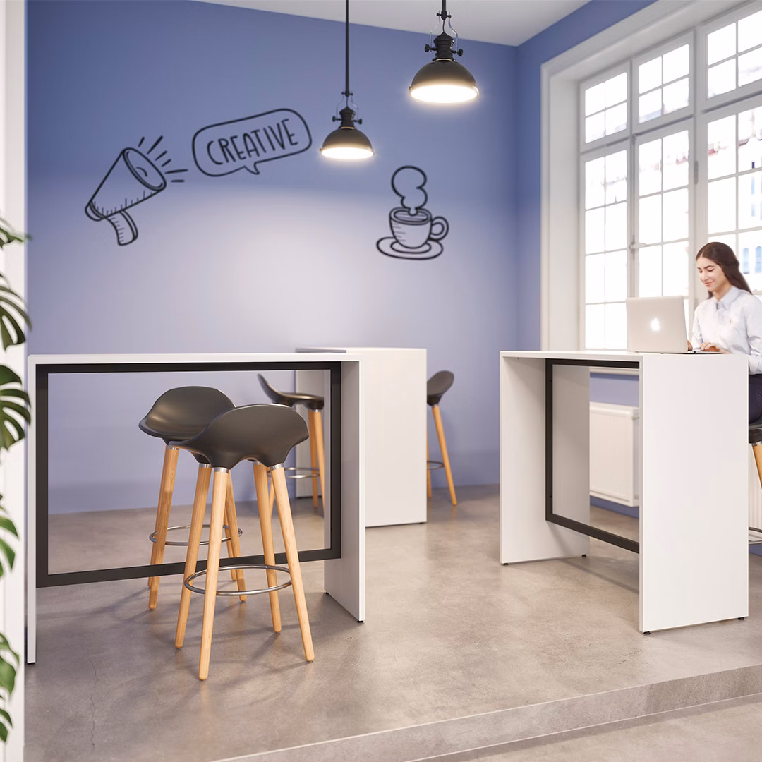 Rondes ou rectangulaires, les tables hautes Détente sont idéales pour aménager des espaces de travail informels.