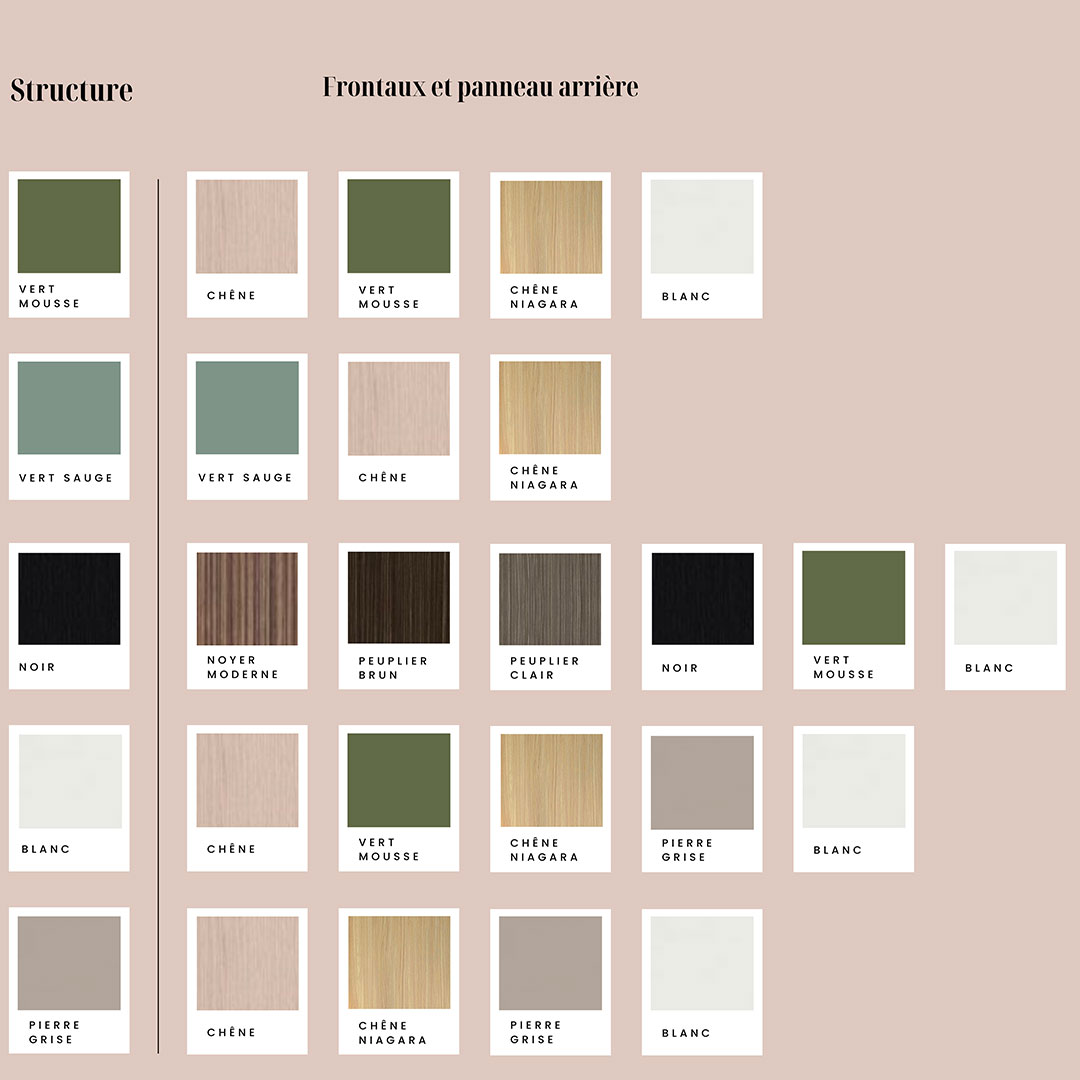L’ensemble est proposé dans plusieurs finitions bois et coloris modernes : vert sauge, vert mousse, stone grey, noir et blanc.