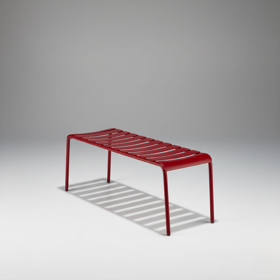 AUSSEN est composé de lattes en aluminium soudées sur une structure tubulaire en aluminium cintré de 25 mm de diamètre. L’ensemble reçoit une finition en peinture poudre avec revêtement polyester (thermolaquage).