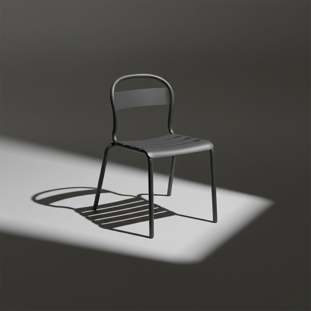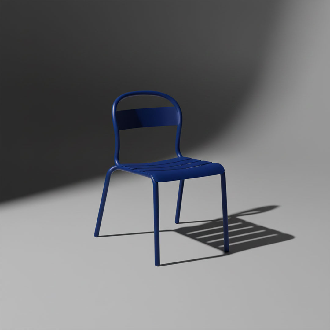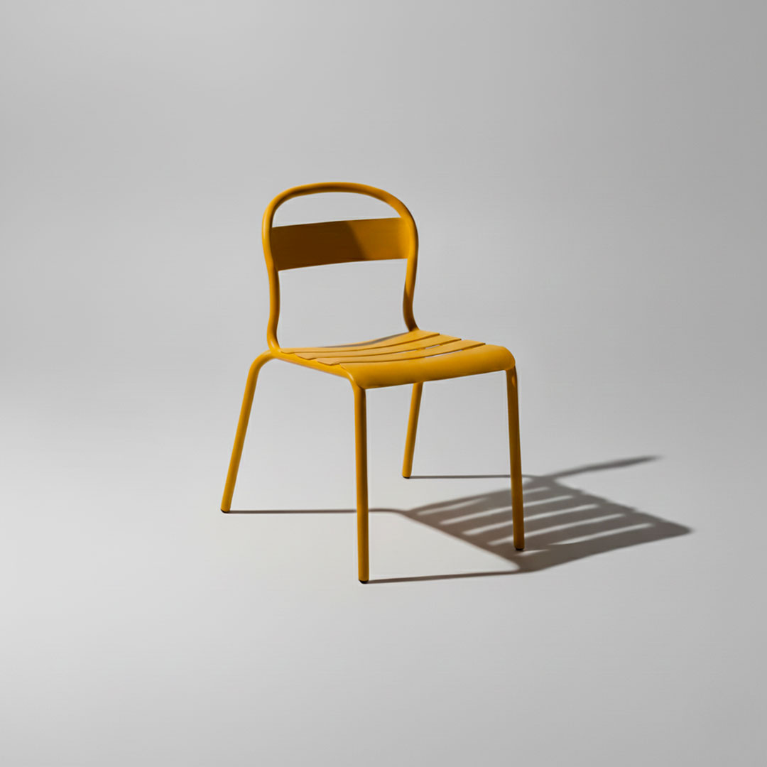 La chaise se compose d’une structure tubulaire en aluminium cintré de 25 mm, avec des lames en tôle d’aluminium soudées. La finition indiquée est une peinture poudre avec revêtement polyester : un thermolaquage qui apporte un aspect uniforme et une identité visuelle nette pour les terrasses. Les finitions colorées disponibles sont : blanc, moutarde, aubergine, vert foncé, gris foncé, bleu foncé et noir.