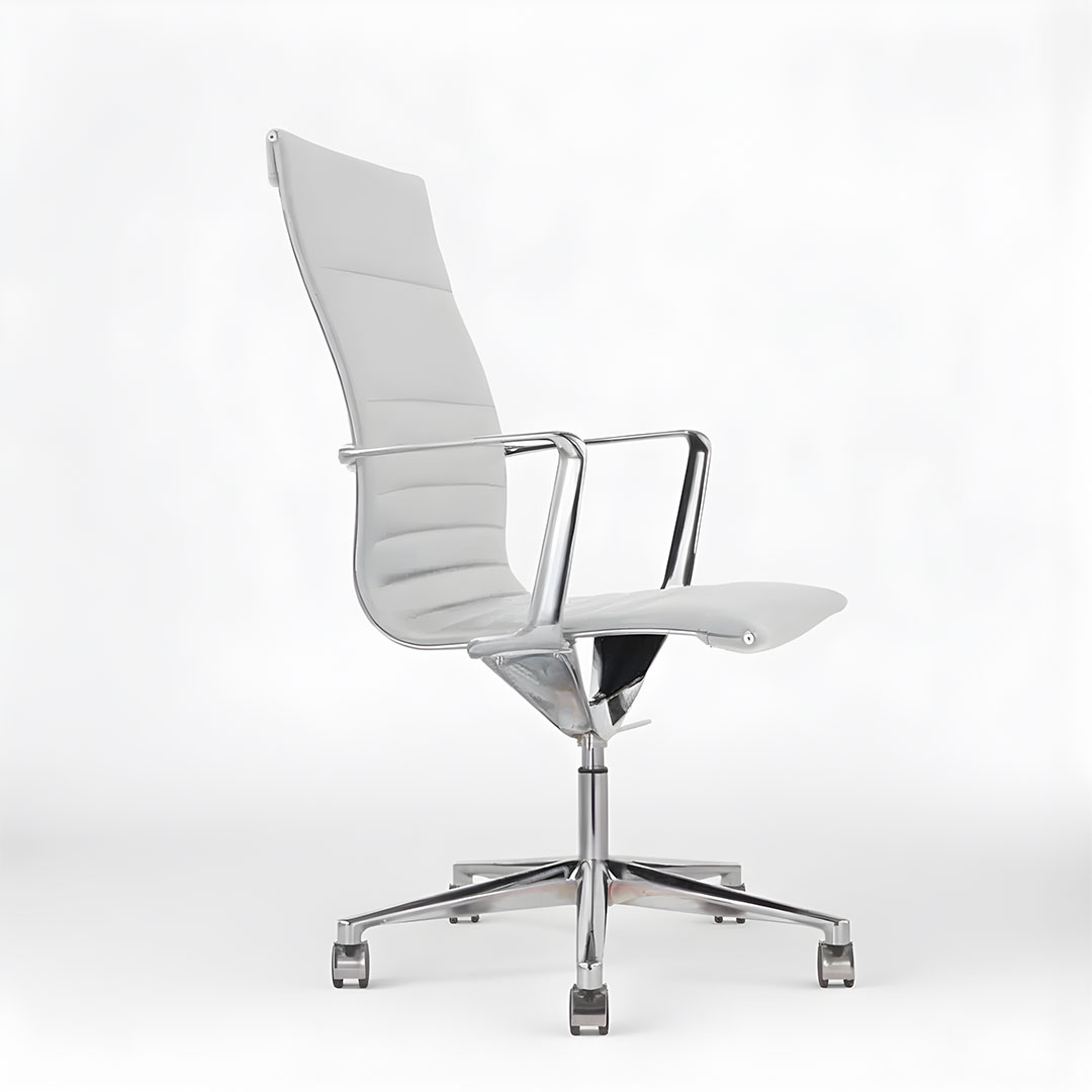Le fauteuil de direction design Sophia est un fauteuil élégant et moderne. Il est disponible en 3 coloris de cuir et simili : blanc, gris et noir. Le cadre et les accoudoirs sont en finition chromée et le piétement en aluminium poli.
