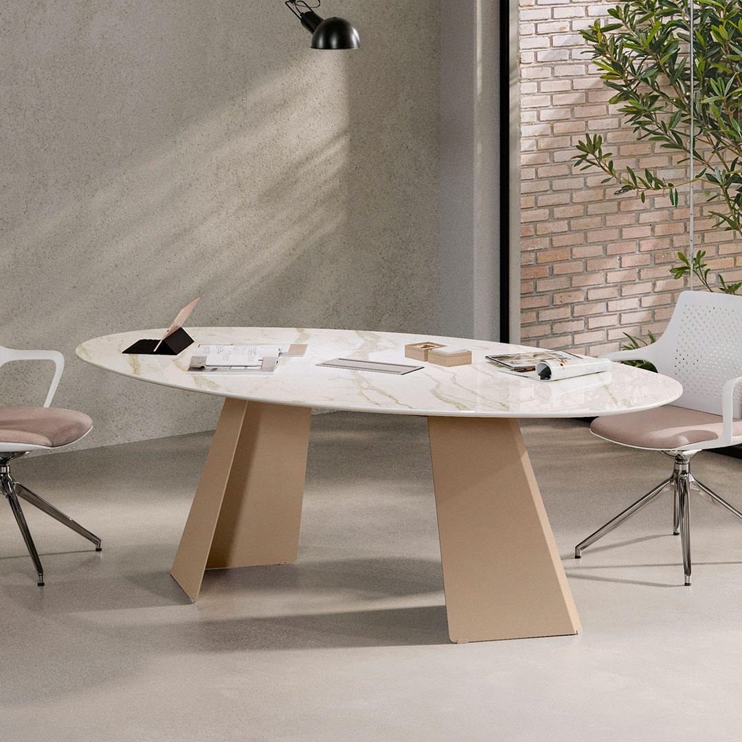 La table de réunion ovale CLASSY séduit par son design raffiné et sa finition haut de gamme en céramique effet marbre.